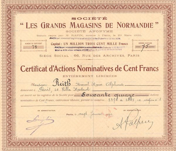 Sté "Les Grands Magasins de Normandie" (Certif Nomin d'Act 100 F)