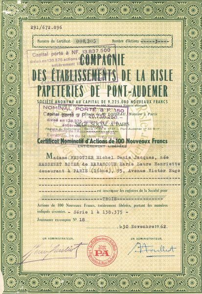 Cie des Ets de la Risle Papeteries de Pont-Audemer (CN Act 100NF)