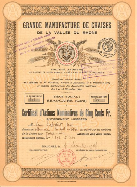 Grande Manufacture de Chaises de la Vallée du Rhone (Certif d'Act Nomin 500 F)