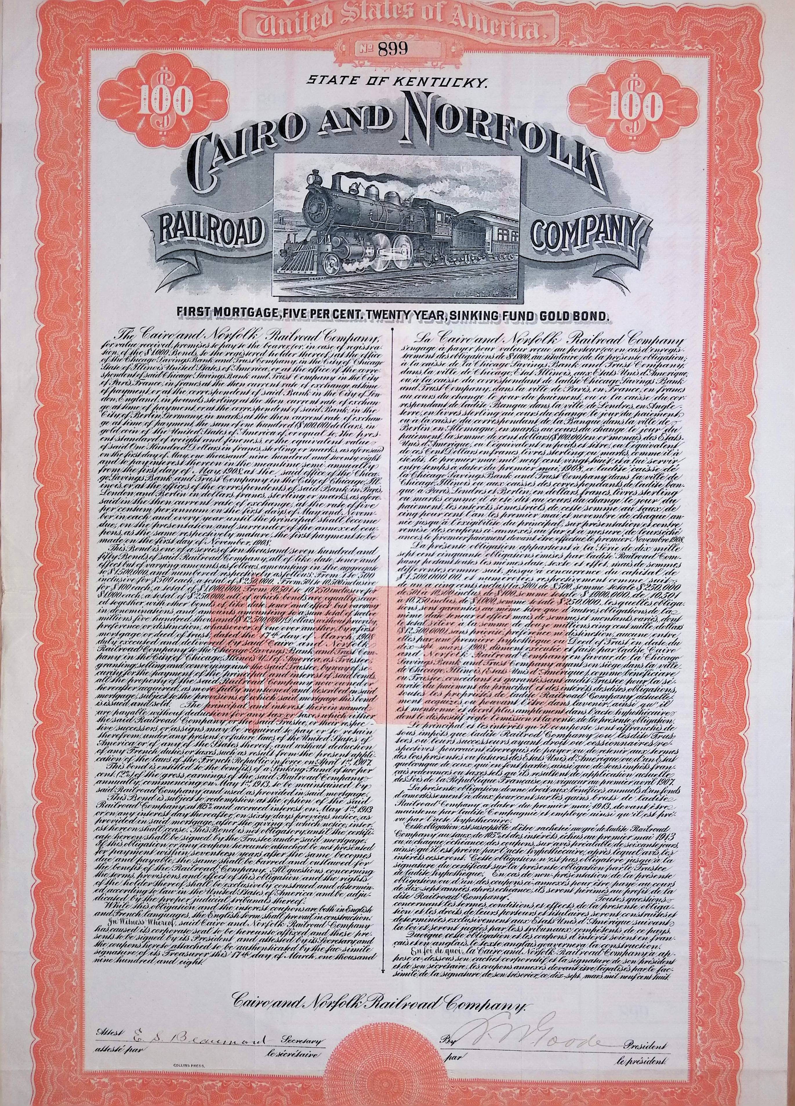 Cairo and Norfolk Railroad Company Gold Bond - Kentucky 1908