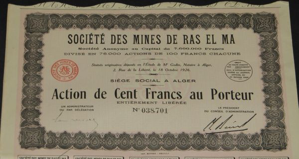 Sté des Mines de Ras El Ma (Act 100 F) (Capital 7600000 francs)