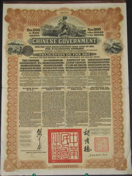 The Chinese Gvt - 5 % Réorganisation Gold Loan of 1913