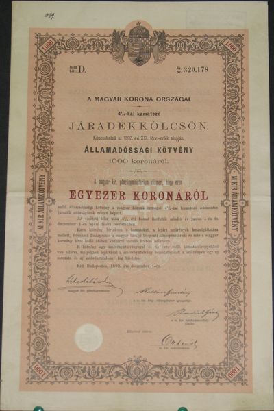 Royaume de hongrie - Emprunt en Rentes 4 % 1892 (1000 Cr)