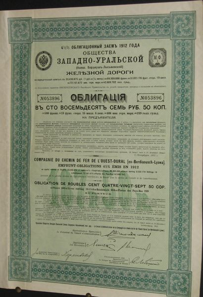 Cie du Chemin de Fer de l'Ouest-Oural (ex-Berdiaousch-Lyswa) - Emprunt-Obligations 4 1/2% 1912
