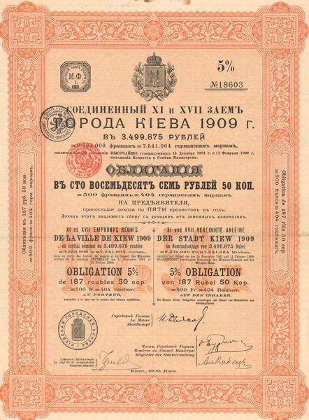 XI et XVII Emprunts Réunis de la Ville de Kiew 1909
