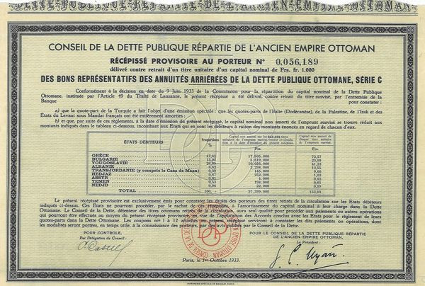 Bons Représentatifs des Annuités Arriérées de la Dette Publique Ottomane "Série C" 1933