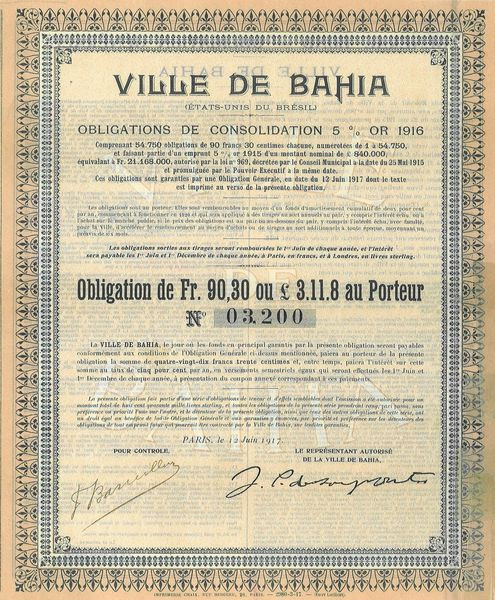 Ville de Bahia - Obligations de Consolidation 5 % Or 1916 (Obl 90.30 Fr)