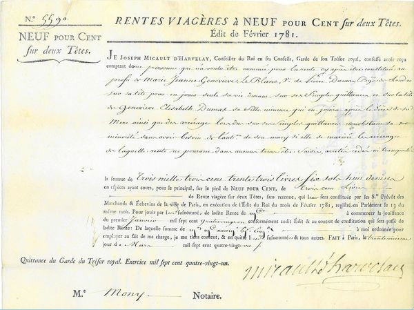 Rente Viagère à 9 % sur Deux Têtes - Rente de 3333 livres 6 sols 8 deniers