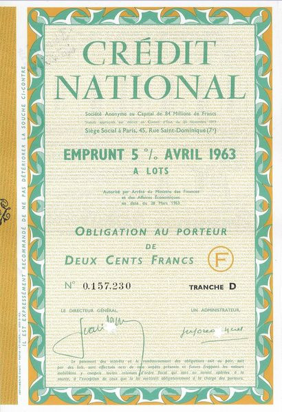 Crédit National - Emprunt 5 % Avril 1963 à lots - Tranche D