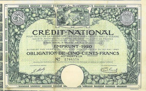 Crédit National - Emprunt 1920 pour Faciliter la Réparation des Dommages Causés par la Guerre