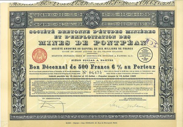 Société Bretonne d'Etudes Minières et d'Exploitation des Mines de Pontpéan (Bon)