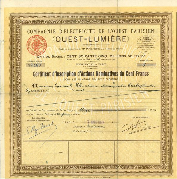 Cie d'electricité de l'Ouest Parisien (Ouest-Lumière)(certif)