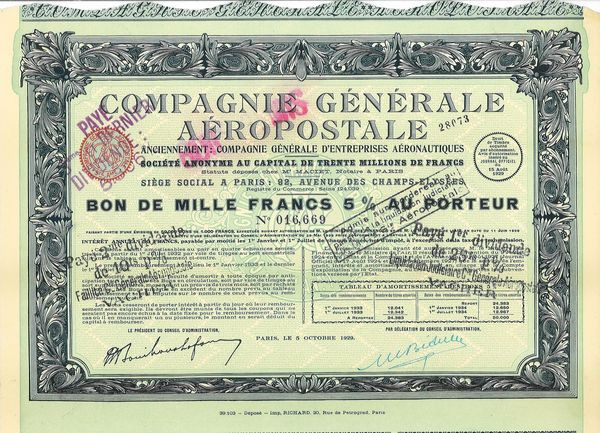 Cie Gale Aéropostale (Bon 1000 F 5 % 1929)