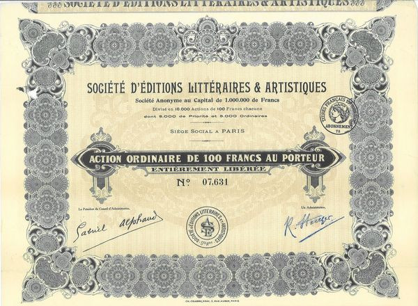 Sté d'Editions Littéraires et Artistiques (Act Ordin 100 F)