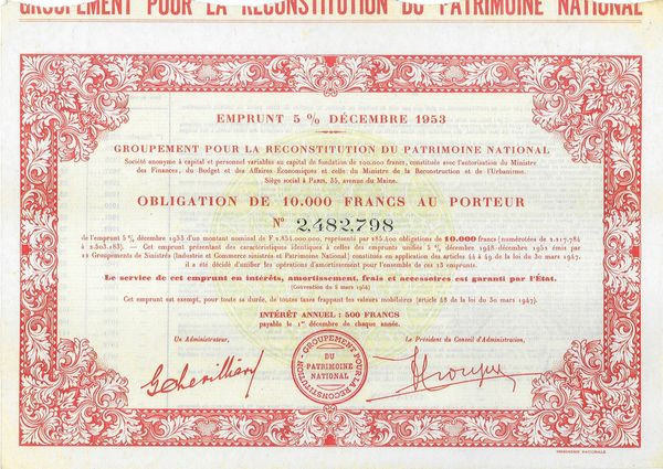 Emprunt 5 % Décembre 1953 - Groupement pour la Reconstitution du Patrimoine National