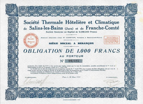 Sté Thermale Hôtelière et Climatique de Salins-les-Bains et de Franche-Comté (Obl 1000 F)
