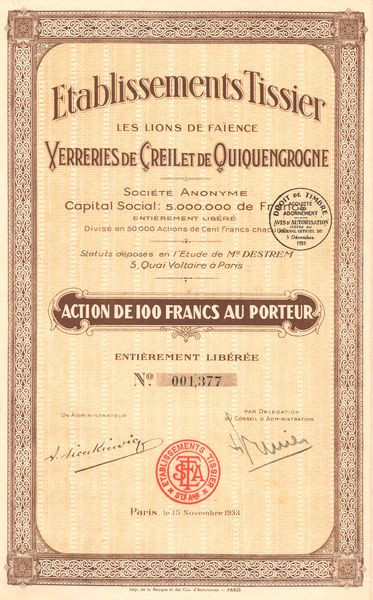 Ets Tissier - Les Lions de Faïence - Verreries de Creil et de Quiquengrogne (Act 100 F)
