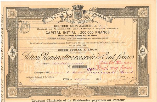 Sté Lyonnaise des Eaux Minérales - Docteur Léon Jacquet & Cie (Act Nom)