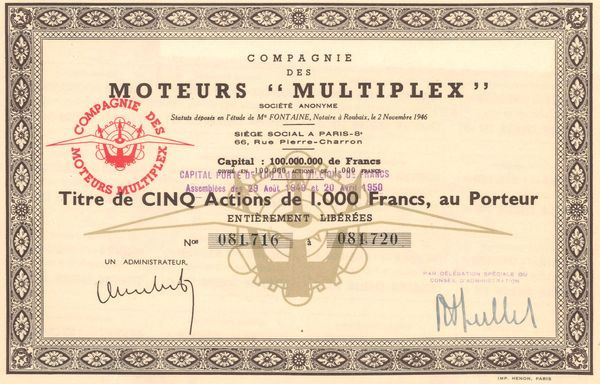 Cie des Moteurs "Multiplex" (Titre de 5 Act 1000 F)