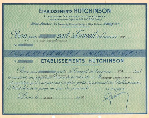 Ets Hutchinson - Cie Nationale du Caoutchouc (Bon 05 Parts de Travail)