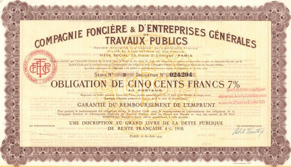 Cie Foncière & d'Entreprises Gale de Travaux Publics (Obl 500 F 7 %)