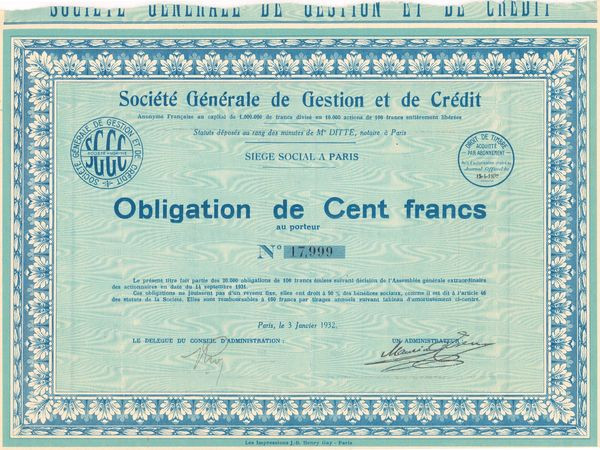 Sté Gale de Gestion et de Crédit (Obl 100 F)