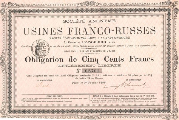 S.A. des Usines Franco-Russes Anc (Anc Ets BAIRD à Saint-Pétersbourg) (Obl 500 F)