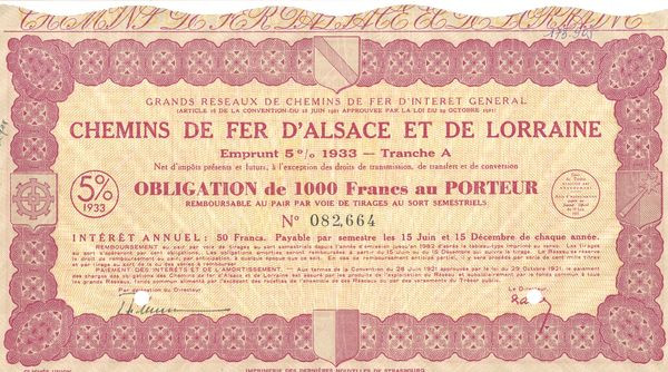 Grands Réseaux de Chemins de Fer d'Intérêt Général - Chemins de Fer d'Alsace et de Lorraine - Emprunt 5 % 1933 (Rouge)(Obl 1000