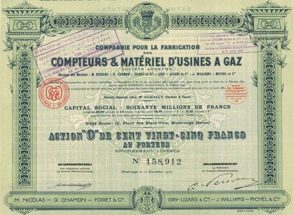 Cie pour la Fabrication des Compteurs & Matériel d'Usines à Gaz - (Nicolas - Chamon - Foiret - Siry - Lizars - Williams - Michel