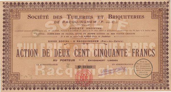 Sté des Tuileries et Briqueteries de Racquinghem (P.-de-C.) (Act 250 F)
