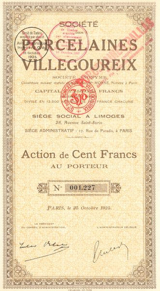 Sté des Porcelaines Villegoureix (Act 100 F)
