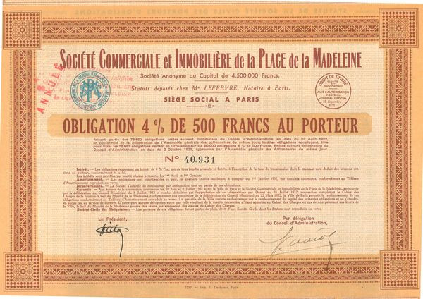 Sté Commerciale et Immobilière de la Place de la Madeleine (Obl 4% 500 F)