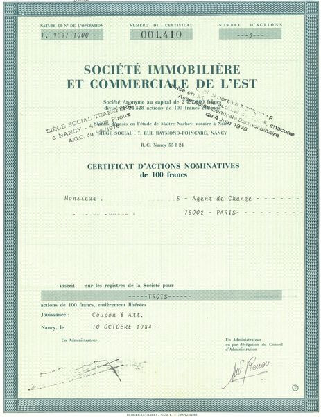 Sté Immobilière et Commerciale de l'Est (Certif d'Act Nomin 100 F)