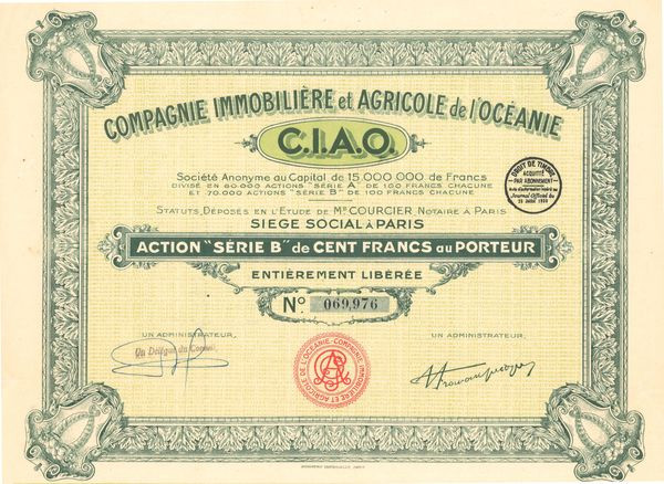 Cie Immobilière et Agricole de l'Océanie C.I.A.O. (Act B 100 F)