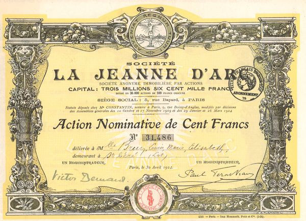 La Jeanne d'Arc S.A. Immobilière par Actions - 1924 (Jaune)(Act Nomin 100 F)
