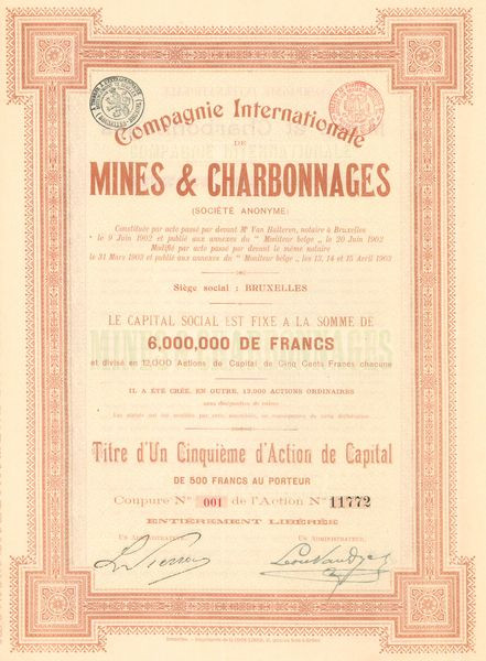 Cie Internationale de Mines et Charbonnages (Titre 1/5eme Act 500 F)