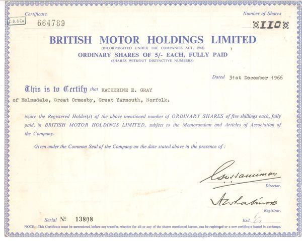 British Motor Holding Ltd (Titre 110 Act 5 £)