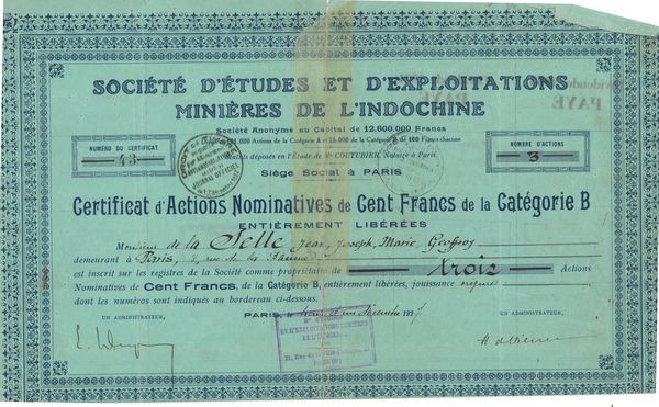Sté d'Etudes et d'Exploitations Minières de l'Indochine (Act Nomin 100 F)