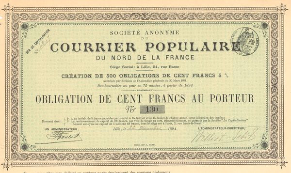 S.A. du Courrier Populaire du Nord de la France (Obl 500 F)