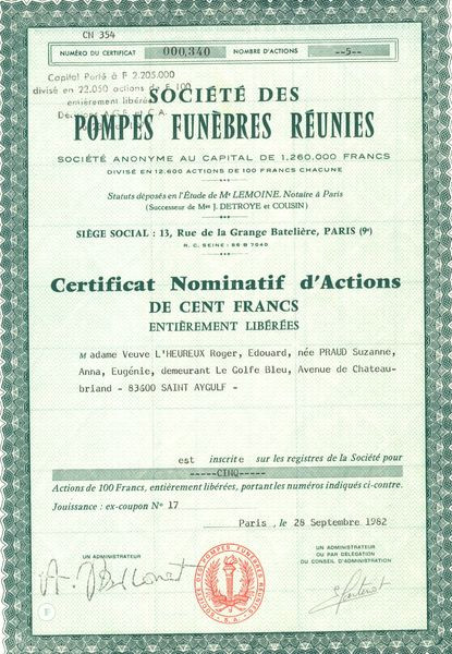 Sté des Pompes Funèbres Réunies (Certif Nomin d'Act 100 F)