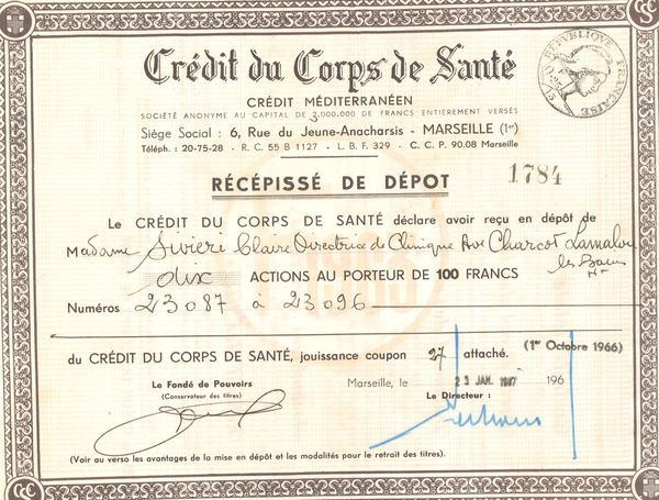 Crédit du Corps de Santé Crédit Méditerranéen (Récipissé de dépôt 100F)
