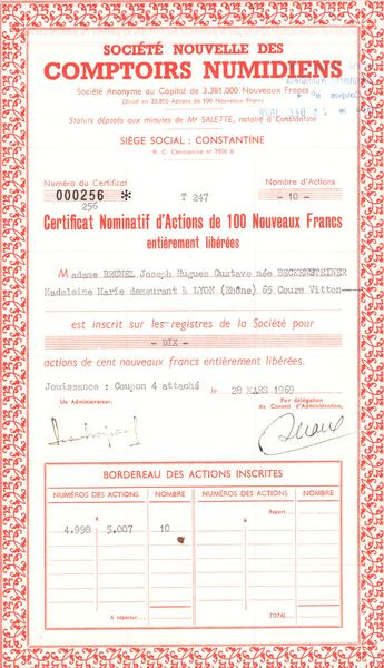 Sté Nouvelle des Comptoirs Numidiens (CN Act 100NF)