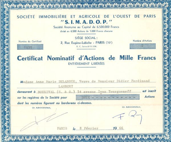 Sté Immobilière et Agricole de l'Ouest de Paris "S.I.M.A.D.O.P." (CN Act 1000F)