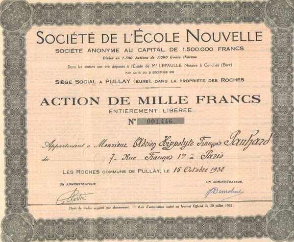 Sté de l'Ecole Nouvelle (Certif Nomin de 1000F)(Modele 2)