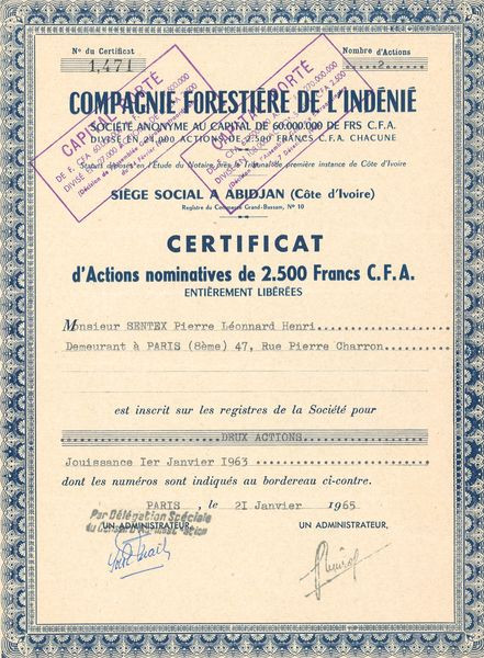 Cie Forestière de l'Indénié (CN Act 2500F CFA)