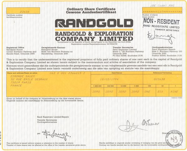 Randgold & Exploration Cy Ltd (Certif Nomin)