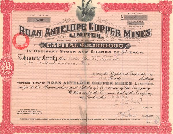 Roan Antelope Copper Mines (certif nomin) (Capital 05 000 000)