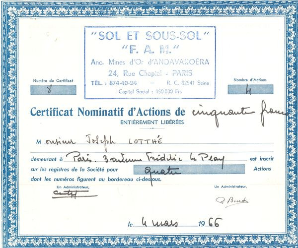 "Sol et Sous-Sol"F.A.M." - Anc Mines d'Or d'ANDAVAKOERA (CN Act 50F)