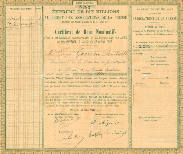 Emprunt de Dix Millions au Profit des Associations de la Presse (CN Bons 20F)