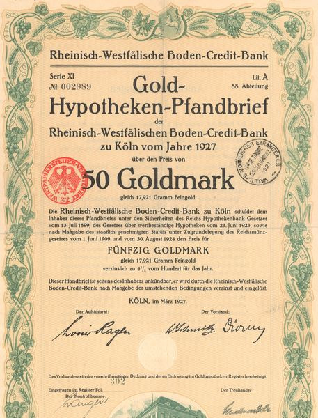 Gold Hypotheken Pfandbrief der Rheinish Westfalischen Boden Credit Bank zu Koln vom Jahre 1927 (Act 50 GoldMark)